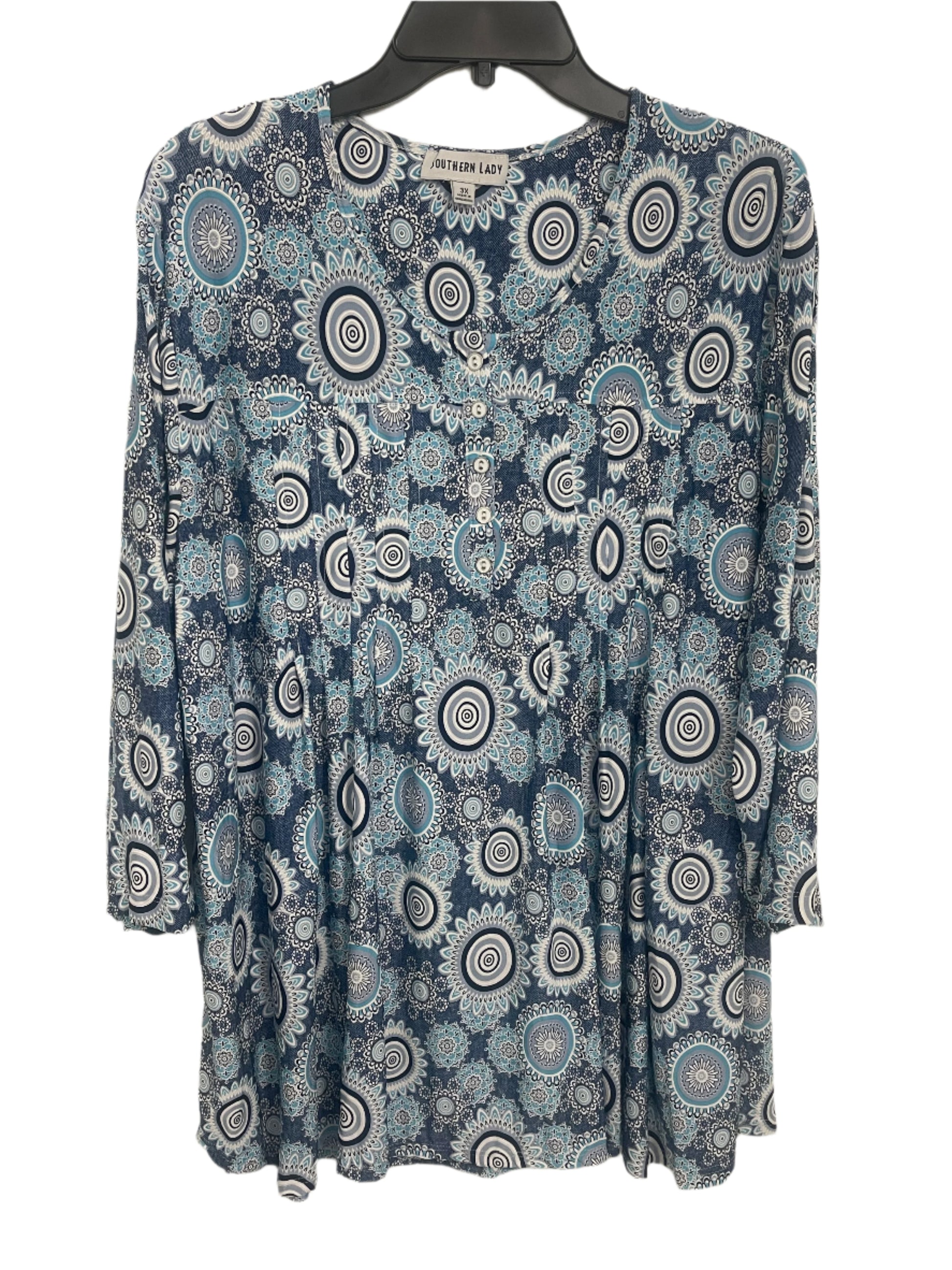 This Plus Size Top is Long with a Fabric in Turq, Blue and Navy Paisley