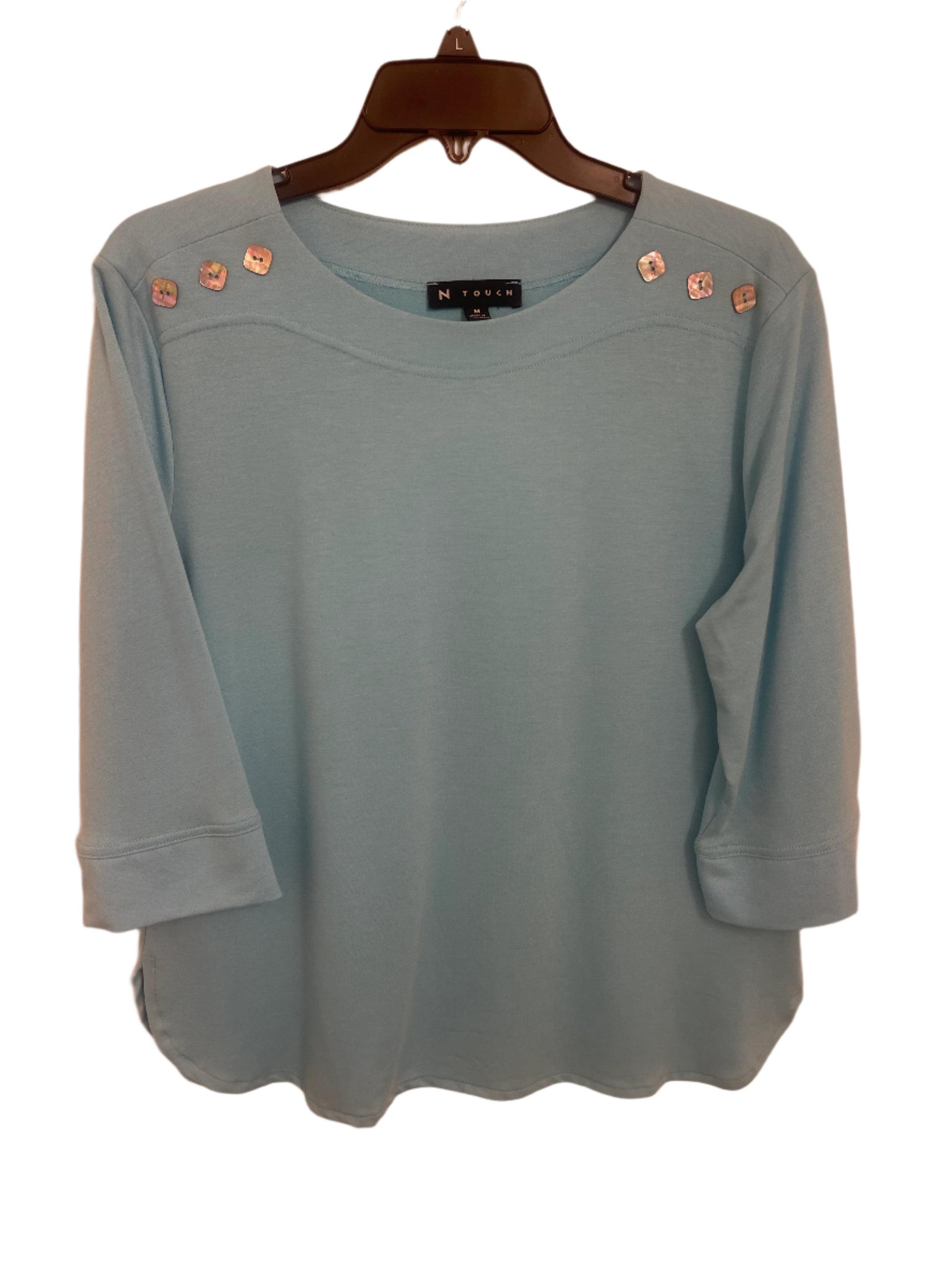 You will love this soft ocean blue top. Interesting stitching at the neckline. Three buttons at the shoulder.